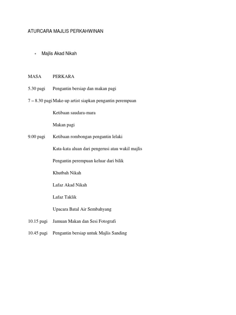 Ketibaan yang diraikan bersama barisan pentadbir. 930 AM TENTATIF MAJLIS PERSANDINGAN PENGANTIN. Paling penting dalam majlis perkahwinan kerana menerusinya ikatan antara seorang lelaki dan seorang perempuan menjadi sah sebagai pasangan suami isteri dan perhubungan antara mereka menjadi halal.